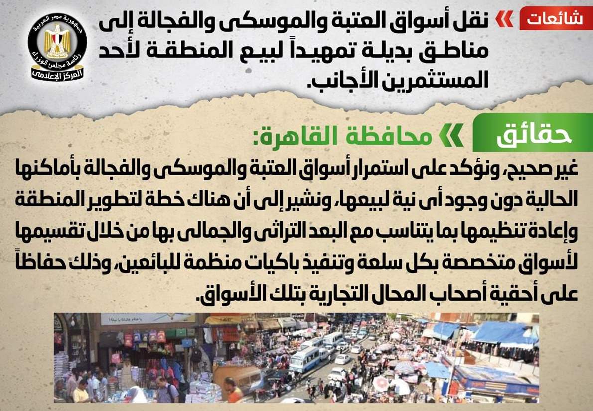 وتواصل المركز الإعلامي لمجلس الوزراء مع محافظة القاهرة، والتي نفت تلك الأنباء، مُؤكدةً أنه لا صحة لنقل أسواق العتبة والموسكي والفجالة إلى مناطق بديلة تمهيداً لبيع المنطقة لأحد المستثمرين الأجانب.