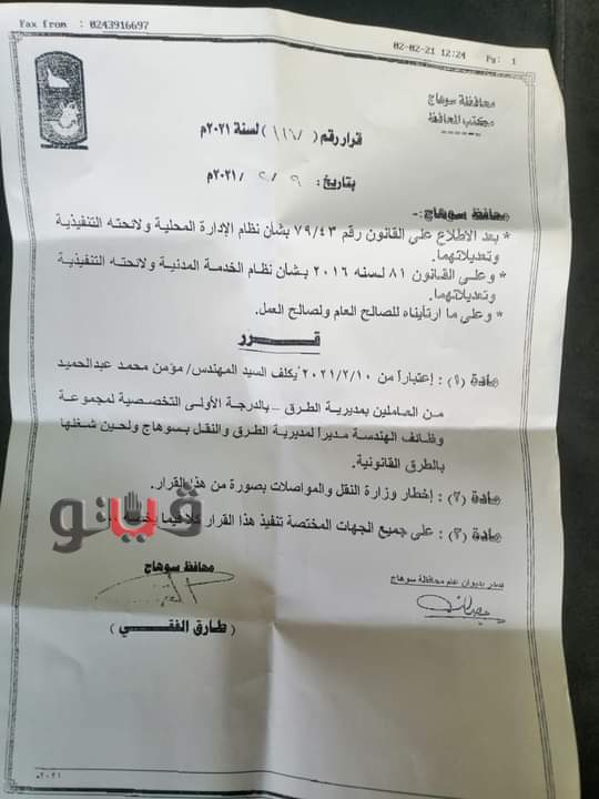الفقى محافظ سوهاج قرارا رقم 177 لسنة 2021 بتكليف المهندس مؤمن محمد عبدالحميد من العاملين بمديرية الطرق بالدرجة