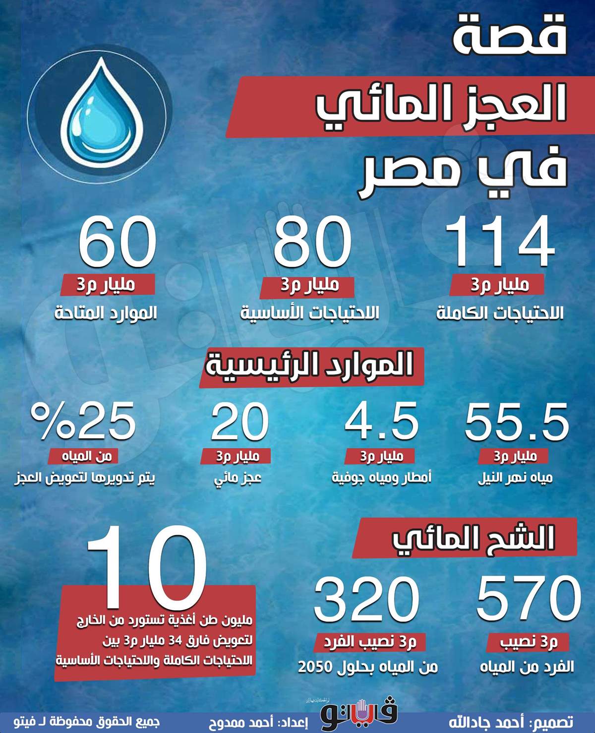 ونوضح بالأرقام في هذا الإنفو جرافيك .. العجز المائي في مصر ونصيب الفرد من المياه واحتياجات مصر الكاملة من المياه وأمور أخرى.