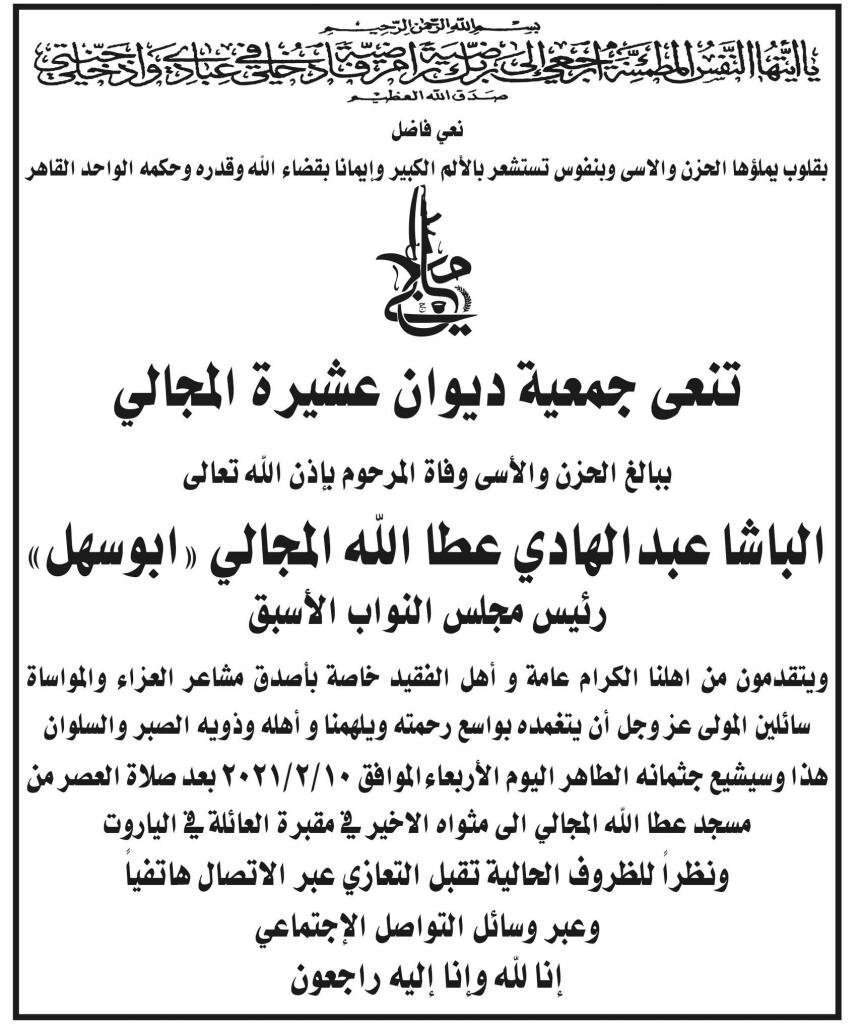 توفي رئيس مجلس النواب الأردني الأسبق، مدير جهاز الأمن العام الأسبق، المهندس عبد الهادي المجالي، اليوم الأربعاء، بعد تلقيه اللقاح المضاد لفيروس كورونا.