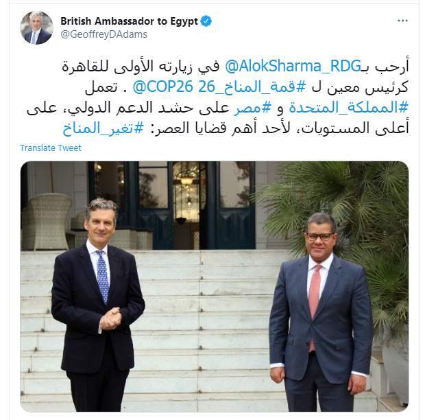 وكتب جيفري آدامز تغريدة على تويتر "أرحب بـ @AlokSharma_RDG في زيارته الأولى للقاهرة كرئيس معين ل #قمة_المناخ_26 @COP26"