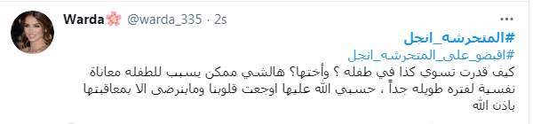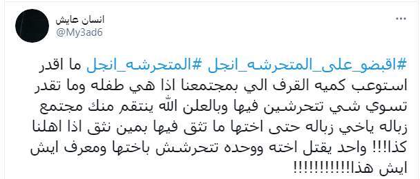 وقال إنسان عايش " #اقبضو_على_المتحرشه_انجل #المتحرشه_انجل ما اقدر استوعب كميه القرف الي بمجتمعنا اذا هي طفله وما تقدر تسوي شي تتحرشين فيها وبالعلن الله ينتقم منك... حتى اختها ما تثق فيها بمين نثق اذا اهلنا كذا!!! واحد يقتل اخته ووحده تتحرش باختها ومعرف ايش ايش هذا!"