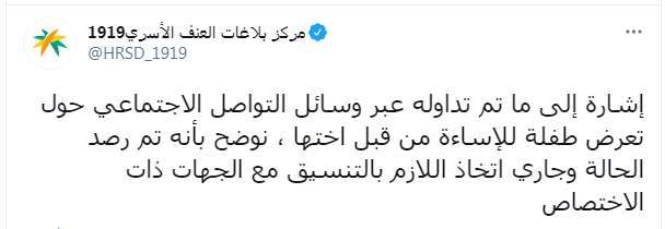 وكتب المركز عبر حسابة الرسمية بتويتر "تم رصد الحالة في مركز العنف الأسري، وجرى توجيهها إلى لوحدة الحماية الأسرية، وتوجيهها إلى وحدة الحماية الأسرية بمنطقة الرياض".