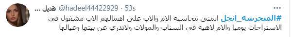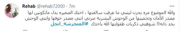 وعلقت هديل "#المتحرشه_انجل اتمنى محاسبه الام والاب على اهمالهم الاب مشغول في الاستراحات يوميا والام لاهيه في السناب والمولات ولاتدري عن بيتها وعيالها"