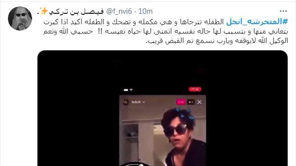 وعلق فيصل بن تركي "#المتحرشه_انجل الطفله تترجاها وهي مكمله وتضحك والطفله اكيد اذا كبرت بتعاني منها و بتسبب لها حاله نفسيه اتمنى لها حياه تعيسه!! حسبي الله ونعم الوكيل الله لايوقفه ويارب نسمع تم القبض قريب".