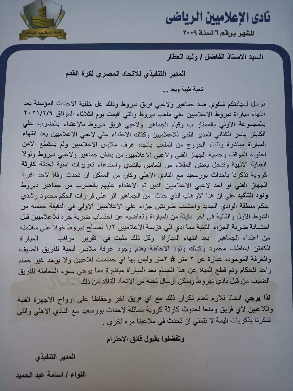 تقدم نادي الإعلاميين بشكوي رسمية لاتحاد الكرة ، ضد نادي ديروط وجماهير النادي بعد الأحداث التي أعقبت لقاء الفريقين بمسابقة دوري القسم الثاني بملعب الأخير مؤخرا.
