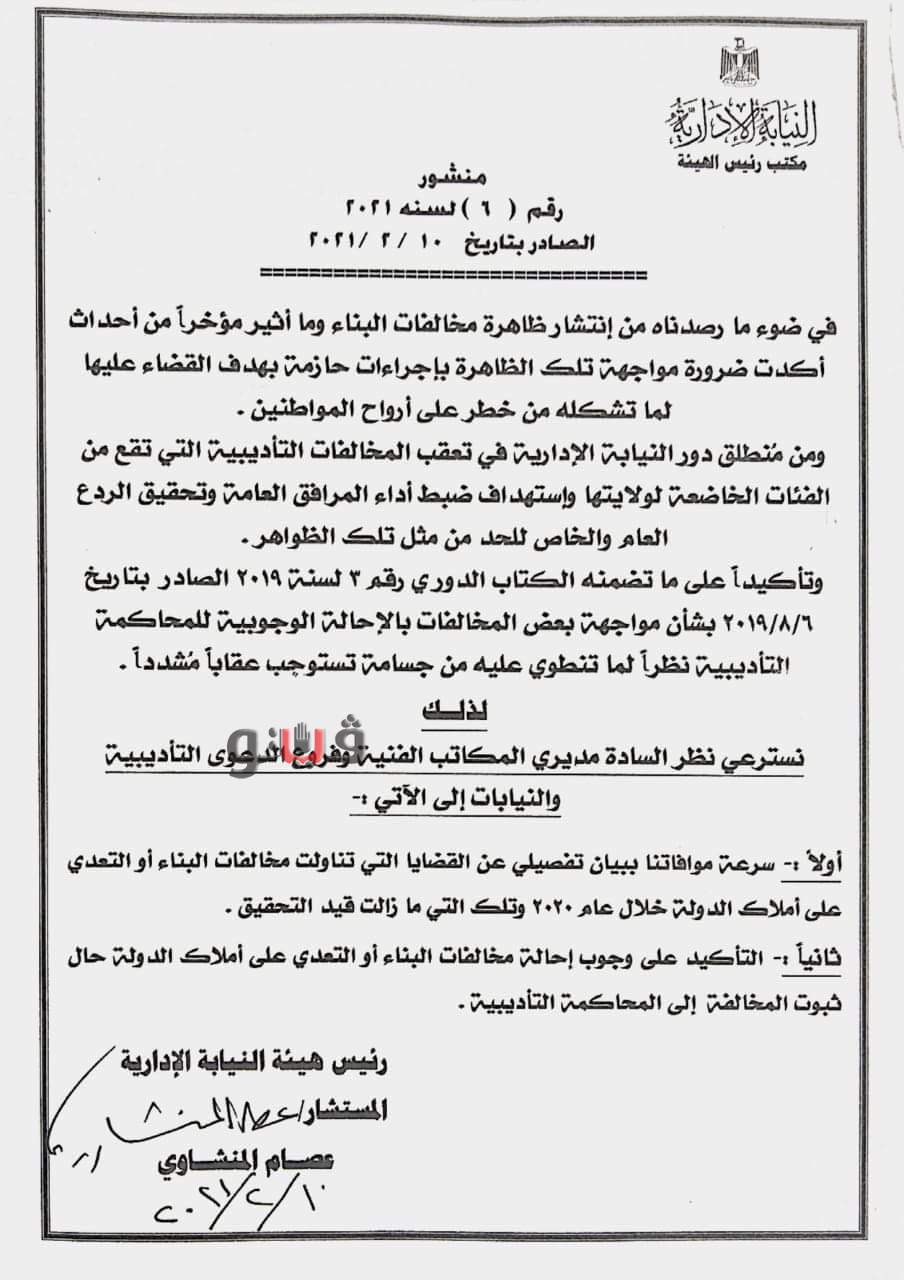 هيئة النيابة الإدارية، المنشور رقم ٦ / ٢٠٢١ الذي أكد على سرعة موافاة رئاسة