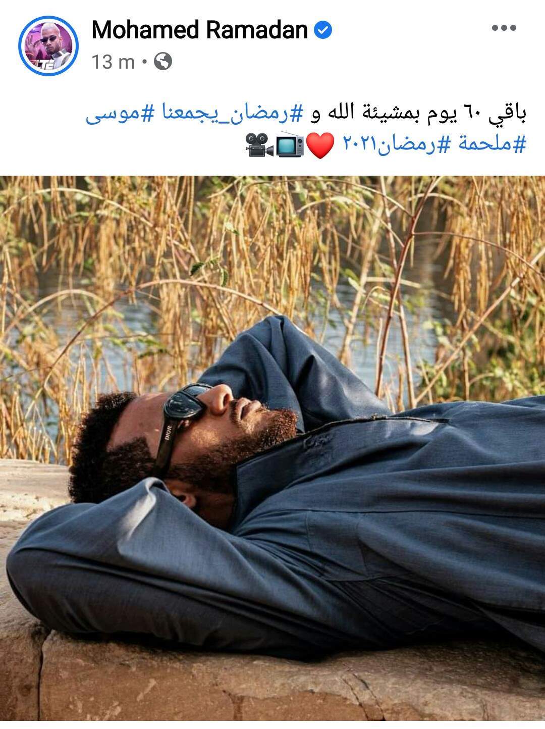 وعلق محمد رمضان على الصورة قائلاً: "باقي ٦٠ يوم بمشيئة الله و #رمضان_يجمعنا #موسى #ملحمة رمضان٢٠٢١ "، حيث حصدت العديد من الإعجابات والتعليقات المميزة.