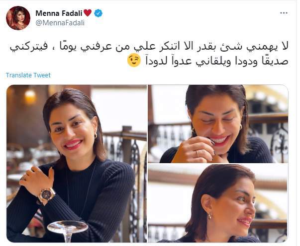 وكتبت منة فضالي تغريدة على تويتر: "لا يهمني شيء بقدر ألا أتنكر على من عرفني يومًا، فيتركني صديقًا ودودا ويلقاني عدوا لدودا".