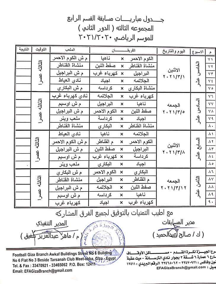 جدول مباريات الدور الثاني لدوري القسم الرابع بالجيزة