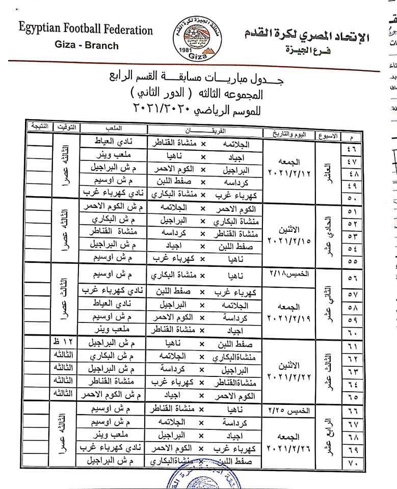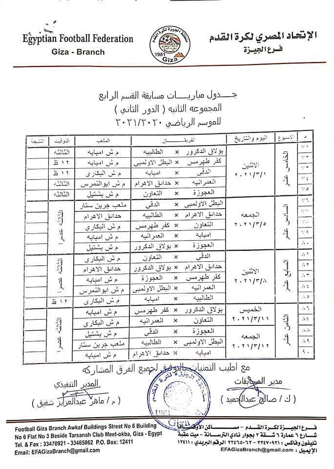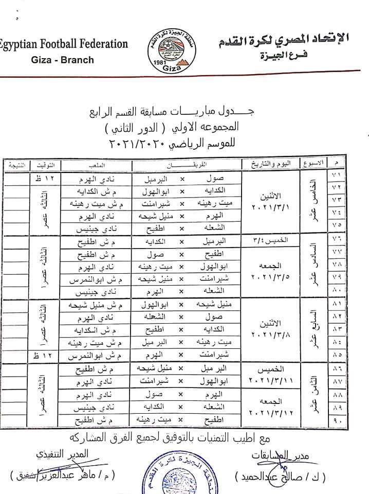 وجاء جداول مباريات الدور الثاني لمسابقة دوري القسم الرابع بالجيزة كالتالي