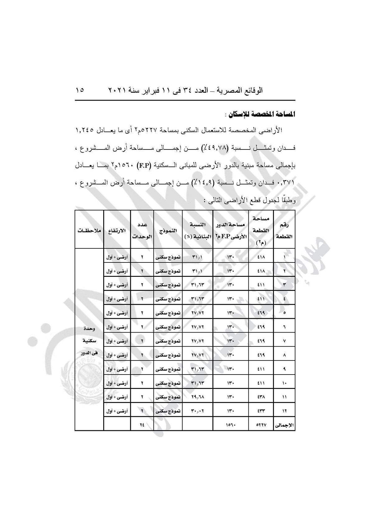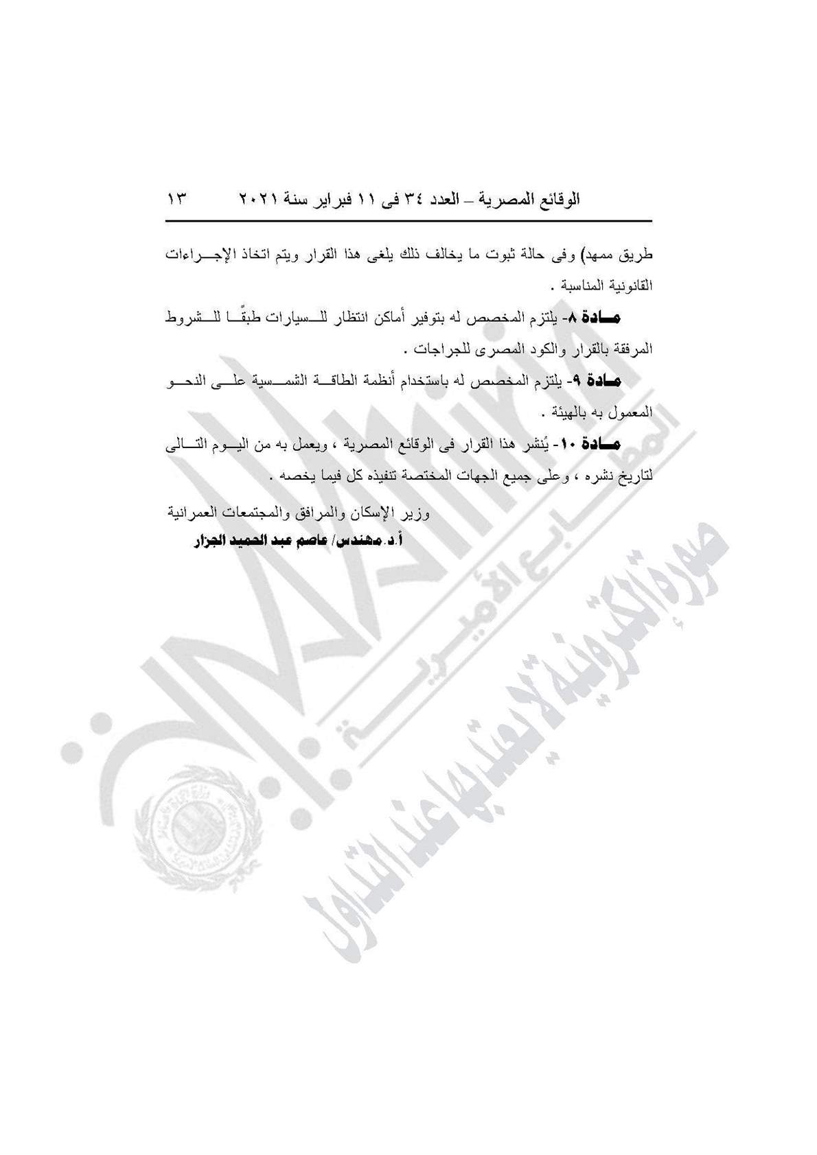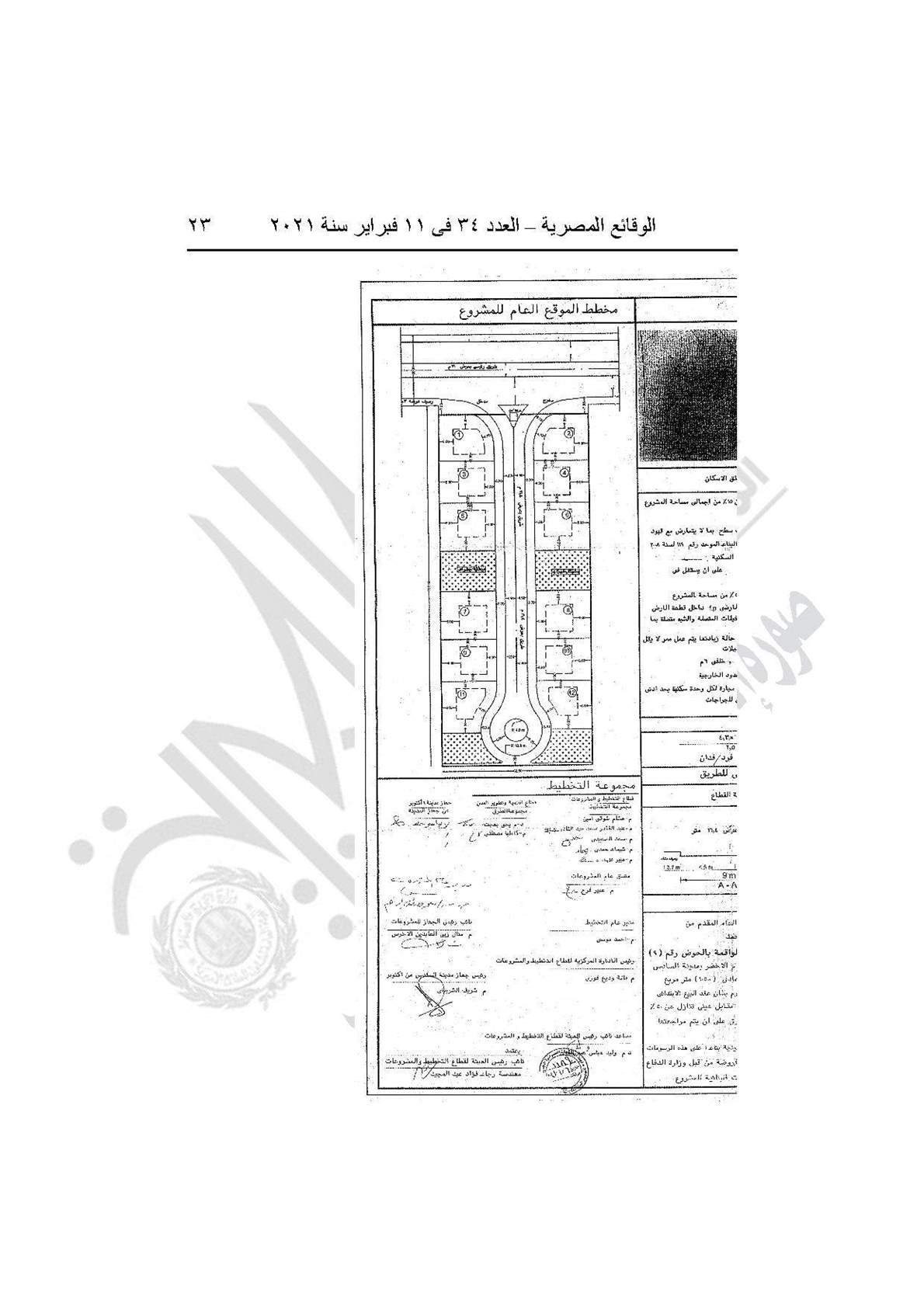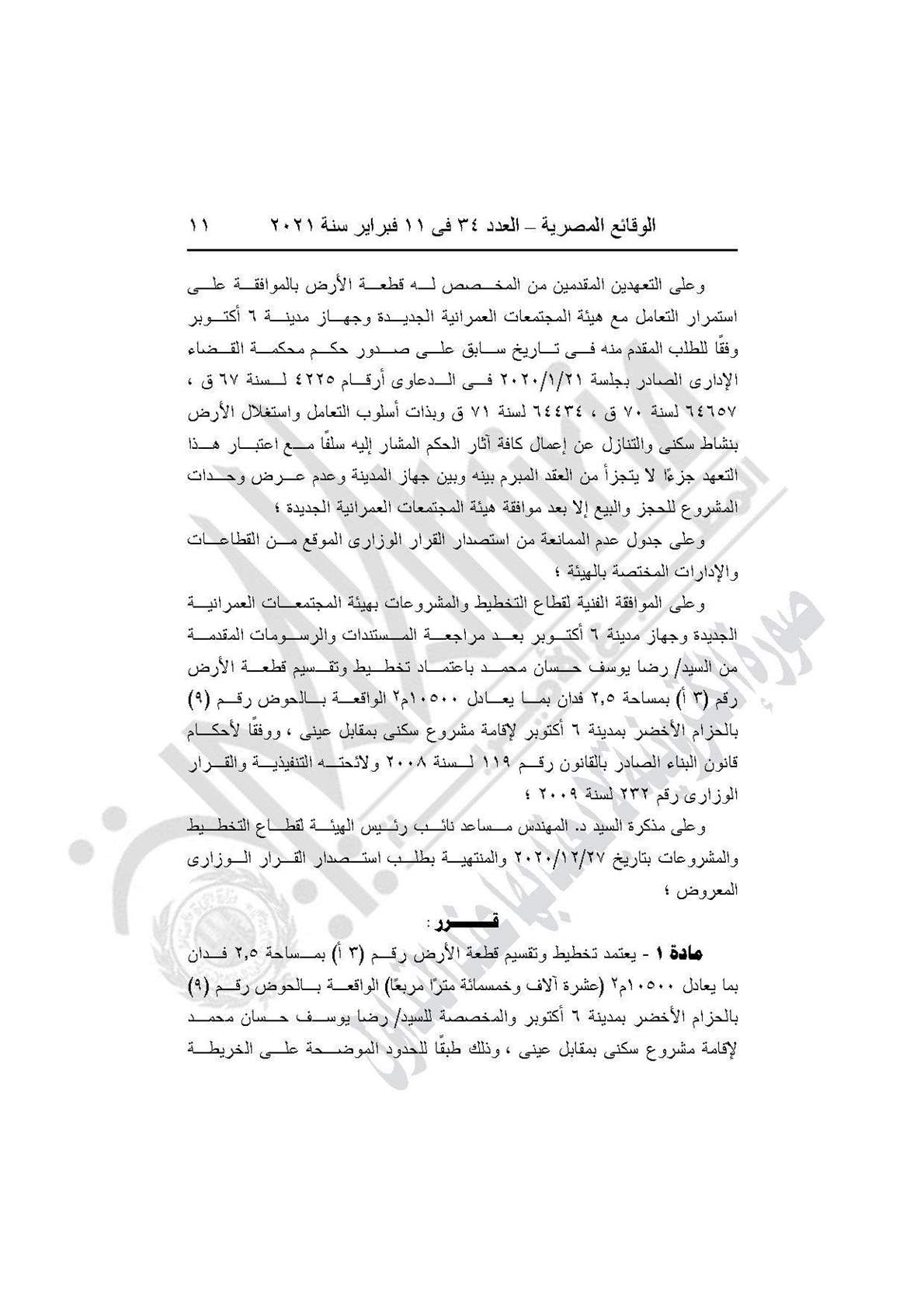 وينص القرار على اعتماد تخطيط وتقسيم قطعة الأرض رقم (3أ) بمساحة 2.5 فدان بمايعادل 10500 الواقعة بالحوض رقم 9 بالحزام الأخضر بمدينة 6 أكتوبر والمخصص لـ رضا حسان محمد، لإقامة مشروع سكني بمقابل عيني، طبقًا للحدود الموضحة على الخريطة.
