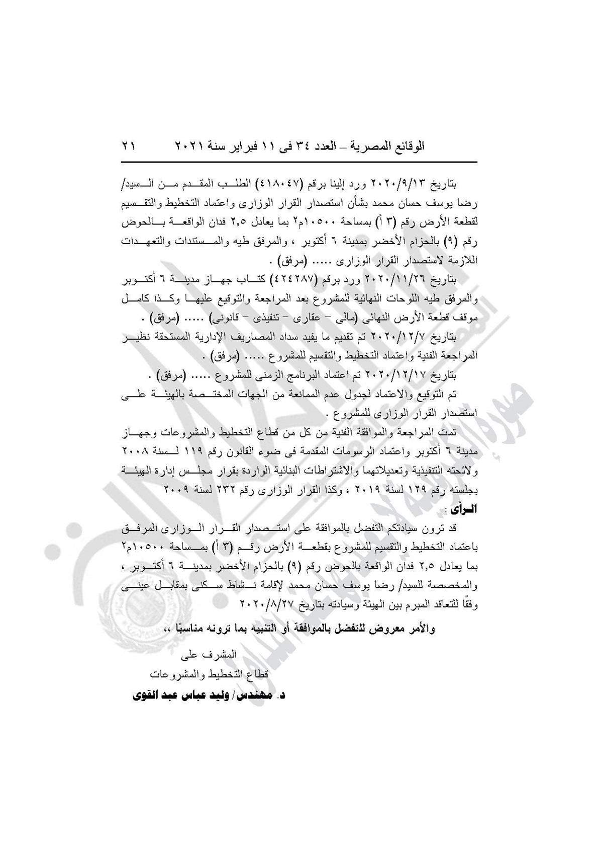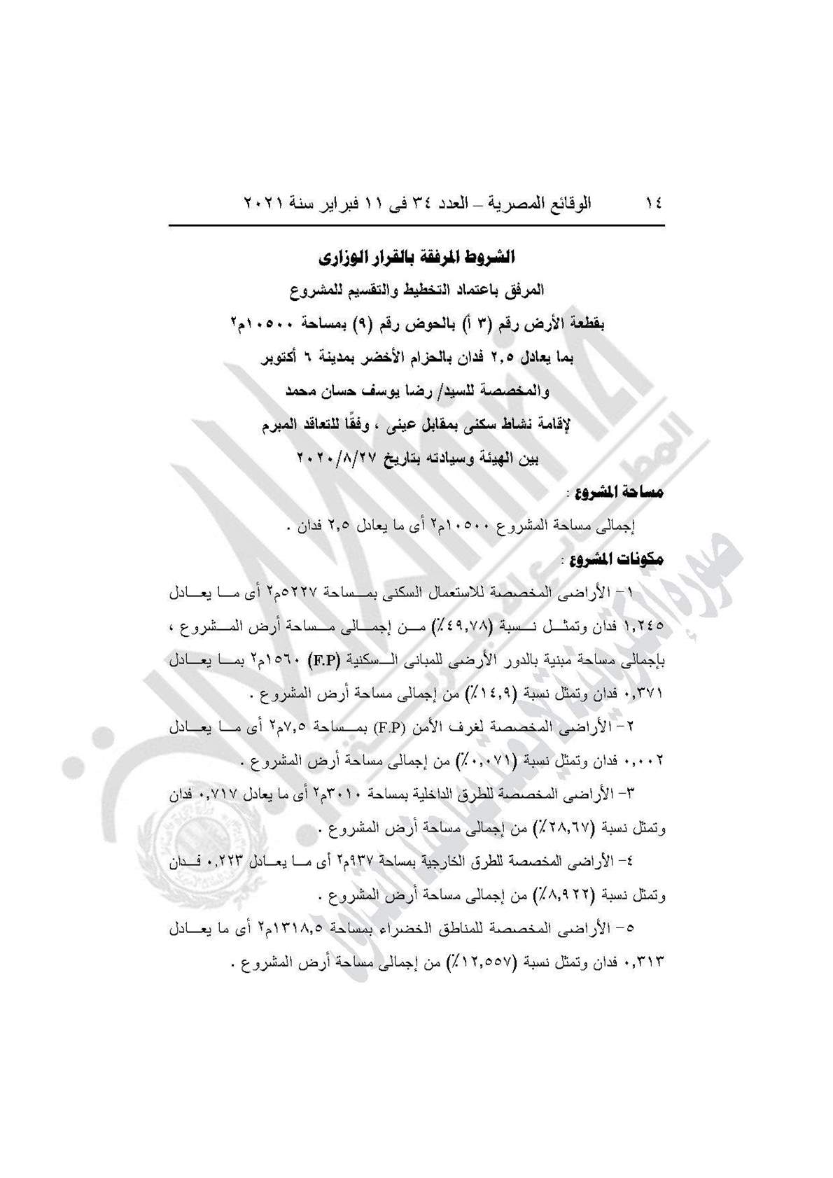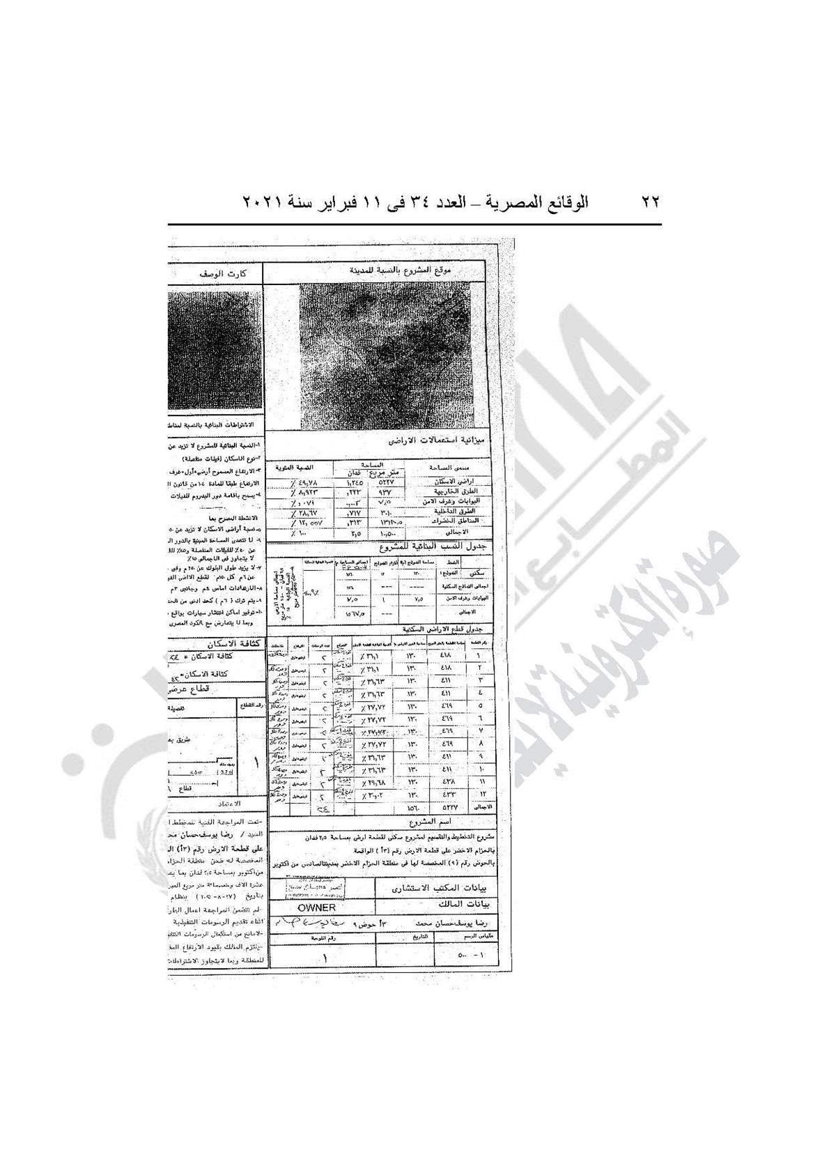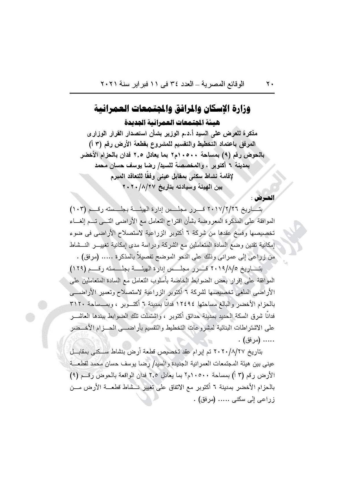 نشرت جريدة الوقائع المصرية في عددها رقم 34، الصادر في 11 فبراير 2021، قرار وزارة الإسكان والمرافق والمجتمعات العمرانية رقم 1 لسنة 2021، باعتماد تخطيط وتقسيم قطعة الأرض رقم (3أ) بمساحة 2.5 فدان بما يعادل 10500 مترًا مربعًا، الواقعة بالحوض رقم 9 بالحزام الأخضر بمدينة 6 أكتوبر المخصصة لـ"رضا يوسف حسان محمد" لإقامة مشروع سكني بمقابل عيني.