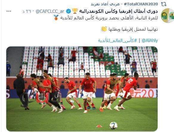 وغرد «كاف» عبر حسابه قائلًا: «للمرة الثانية الأهلي يحصد برونزية كأس العالم للأندية.. تهانينا لممثل أفريقيا وبطلها».