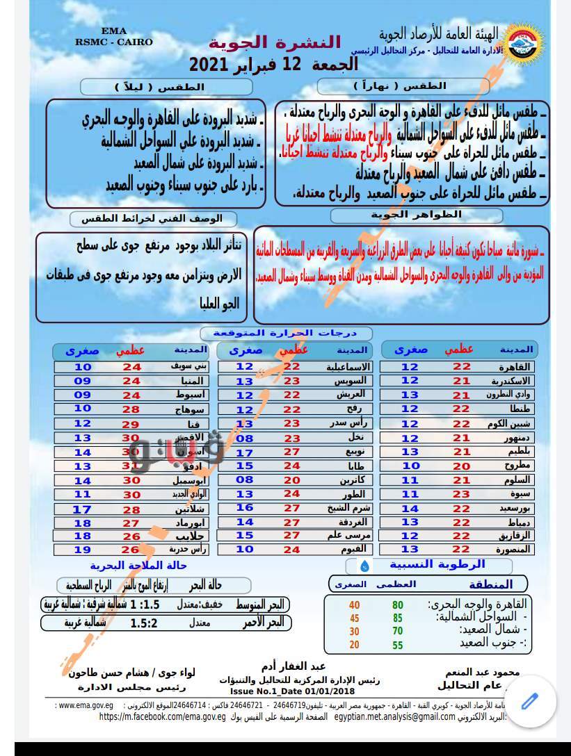 حالة الطقس ودرجات الحرارة المتوقعة غدا الجمعة 12-2-2021