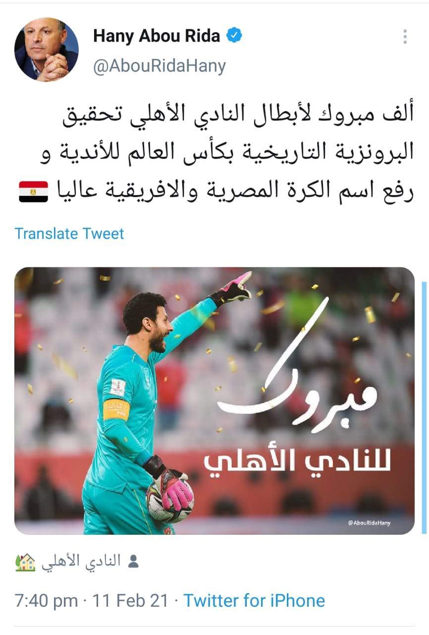 وقال هاني أبو ريدة عبر حسابه الرسمي على موقع التواصل الاجتماعي الشهير فيسبوك: "ألف مبروك لأبطال النادي الأهلي تحقيق البرونزية التاريخية بكأس العالم للأندية و رفع اسم الكرة المصرية والافريقية عاليا".
