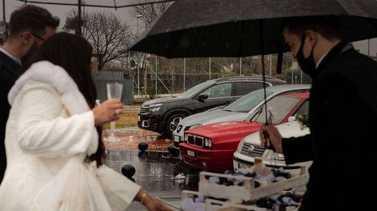 وتجمع 130 ضيفاً لحضور حفل زفاف الثنائي جوليا فلوريان وباولو بافاريسكو، وكلاهما 31 عاماً، من مدينة أسولو بمقاطعة تريفيزو بشمالي إيطاليا، لكن هذه المرة داخل سياراتهم.