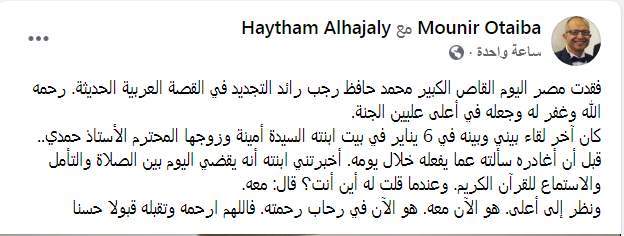 وأعلن الأديب منير عتيبة عبر صفحته على موقع التواصل الاجتماعي "فيس بوك"، نبأ وفاة الكاتب محمد حافظ رجب قائلًا: "فقدت مصر اليوم القاص الكبير محمد حافظ رجب رائد التجديد في القصة العربية الحديثة.. رحمه الله وغفر له وجعله في أعلى عليين".