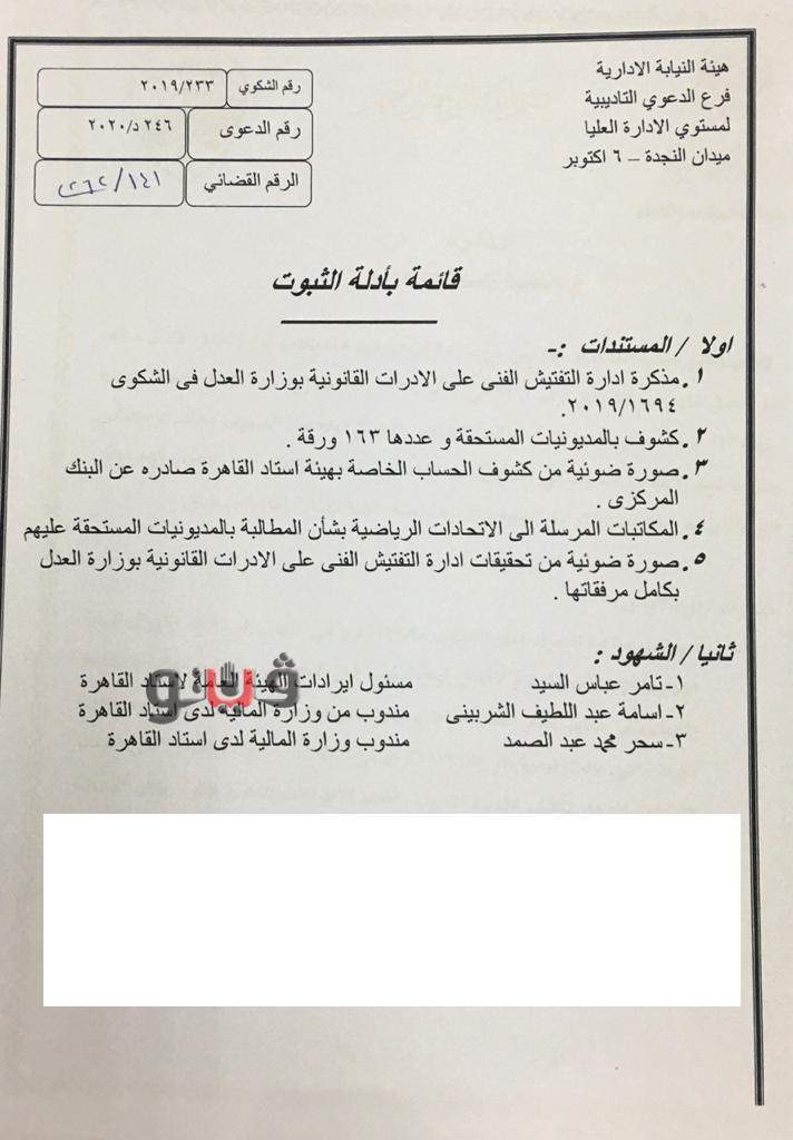 وتضمنت قائمة أدلة الثبوت مذكرة إدارة التفتيش الفني على الإدارات القانونية بوزارة العدل في الشكوى 1694 لسنة 2019، وكشوف المديونيات المستحقة وعددها 163 ورقة، وصورة ضوئية من كشوف الحساب الخاصة بهيئة ستاد القاهرة صادرة عن البنك المركزي، وأقوال مندوبي وزارة المالية ومسئول الإيرادات بالهيئة.