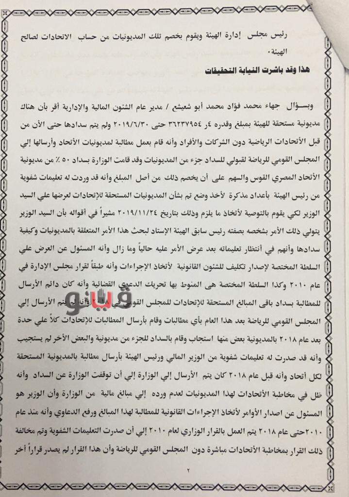 كما أرفق بالبلاغ محاضر التحقيق وكشوف بالمديونيات بعدد 163 ورقة، وإفادة بأنه لم يرد من الإدارة القانونية أي قرار بإقامة دعاوى قضائية للمطالبة حيث تقوم الإدارة المالية بإستاد القاهرة بإرسال المديونيات للوزير أو رئيس مجلس إدارة الهيئة العامة لإستاد القاهرة لخصم تلك المديونيات من حساب الإتحادات لصالح الإستاد.