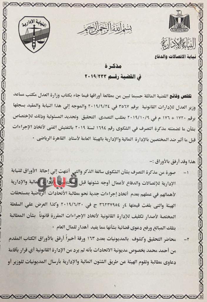 وأرفق بالبلاغ صورة من مذكرة التصرف بشأن الشكوى التي إنتهت إلى إحالة الأوراق للنيابة الإدارية لإعمال أوجه شئونها بشأن عدم إتخاذ إجراءات جدية نحو مطالبة الإتحادات الرياضية لسداد مستحقات إستاد القاهرة والتي بلغت قيمتها 36.3 مليون جنيه، وكذا عدم العرض على السلطة المختصة لإصدار تكليف للإدارة القانونية لإتخاذ الإجراءات المقررة قانونًا بشأن المطالبة بتلكم المبالغ ورفع دعوى قضائية بشأنها مما ترتب عليه إهدار المال العام.