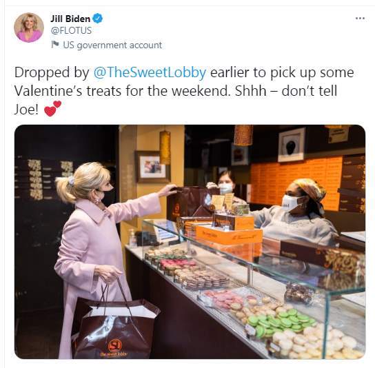 وكتبت جيل بايدن تغريدة على تويتر "اشتريت قليل من الحلوى من سويت لوبي مبكرًا، للاحتفال عيد الحب "الفلانتين" بإجازة نهاية الأسبوع. لا تخبروا جو!"
