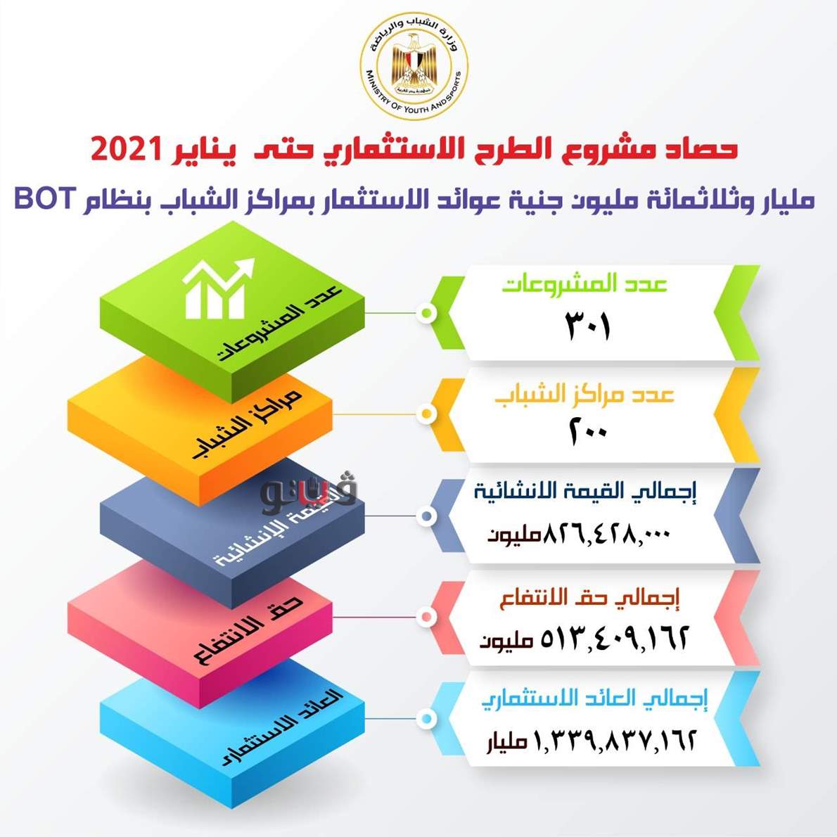 أعلن الدكتور أشرف صبحي وزير الشباب والرياضة، أن العوائد الاستثمارية لمشاريع الطرح الاستثماري بنظام حق الانتفاع والتي ينفذها القطاع الخاص بمراكز الشباب بالجمهورية ضمن مشروع الطرح الاستثماري بمراكز الشباب الذي تم إطلاقه في أغسطس من العام 2018، بلغت مليار وثلاثمائة مليون جنيه .