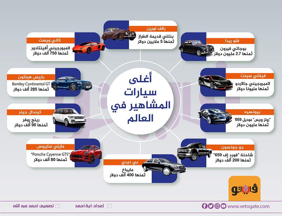 أغلى سيارات المشاهير في العالم | إنفوجراف الأحد 14/فبراير/2021 - 07:12 م 2/14/2021 7:12:25 PM أغلى سيارات مشاهير العالم آية أحمد شارك طباعة 18 حجم الخط شارك طباعة مايلي سايروس سيارة بيونسيه اغني ازواج هوليوود سيارات المشاهير في العالم سيارة كيندال جينر سيارة باريس هيلتون سيارة كاني ويست سيارة ديفيد بيكهام