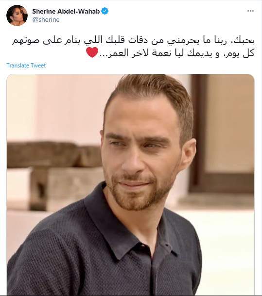 وكتبت شيرين عبد الوهاب تغريدة على تويتر "بحبك، ربنا ما يحرمني من دقات قلبك اللي بنام على صوتهم كل يوم، ويديمك ليا نعمة لآخر العمر".