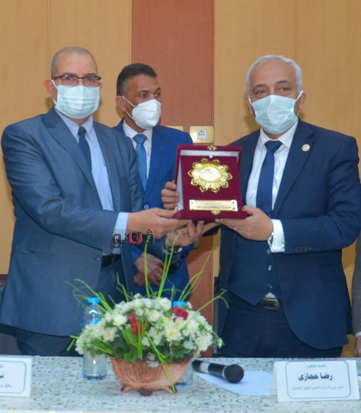 وفى نهاية اللقاء قدم الدكتور نبوي باهي درع المديرية هدية تذكارية ترحيبا بنائب الوزير لشئون المعلمين، معربًا عن سعادته بهذا اللقاء المثمر على أمل تكراره قريبًا للوقوف على تطوير التنمية المهنية المستدامة لمعلمي بورسعيد.