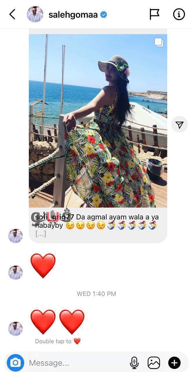ونشرت الراقصة الأرمينية صوفينار التى عرفها الجمهور منذ ظهورها على الساحة باسم "صافيناز"، صورة عبر صفحتها الرسمية على موقع التواصل الاجتماعي "فيس بوك"، رسالة وصلت لحسابها على موقع الصور والفيديوهات الشهير "إنستجرام" تعليقًا على فيديو لها من حساب يحمل اسم لاعب النادي الأهلي السابق، صالح جمعة وموثق بالعلامة الزرقاء.