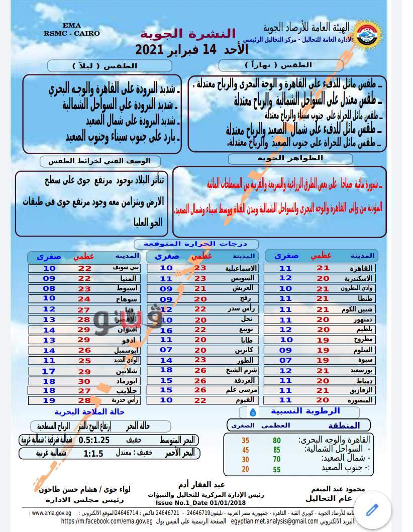 حالة الطقس ودرجات الحرارة المتوقعة اليوم الأحد 14-2-2021 في مصر