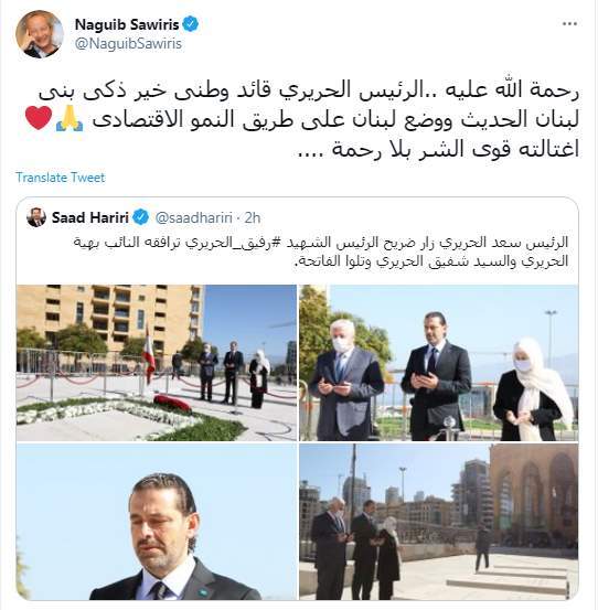 وكتب ساويرس تغريدة على تويتر قال فيها: "رحمة الله عليه ..الرئيس الحريري قائد وطني خير ذكي بنى لبنان الحديث ووضع لبنان على طريق النمو الاقتصادي. اغتالته قوى الشر بلا رحمة....".
