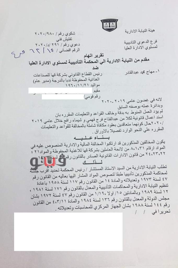 قررت وزارة العدل في القضية رقم 14 لسنة 63 قضائية عليا إحالة رئيس القطاع القانوني بشركة قها للأغذية المحفوظة للمحاكمة التأديبية العاجلة بعد ثبوت إرتكابه مخالفات مالية وإدارية وقانونية خلال الفترة عامي 2019 و2020.