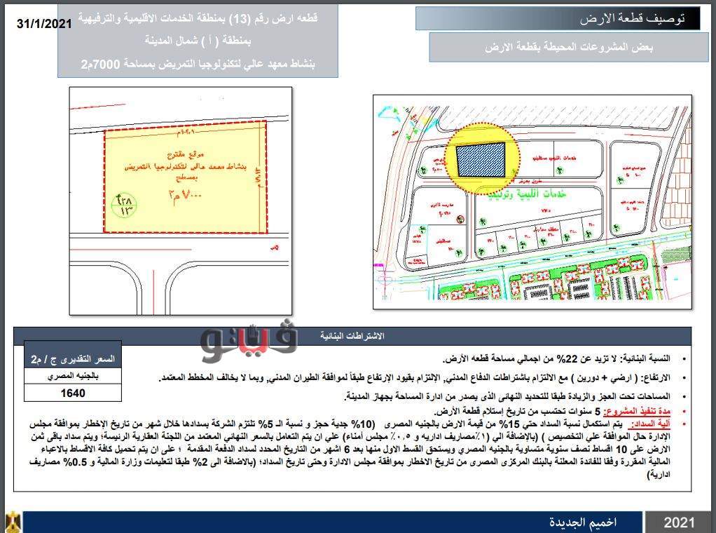 وتُطرح بمدينة أخميم الجديدة أرض تعليمية بمساحة 7 آلاف متر بسعر 1640 جنيها للمتر.