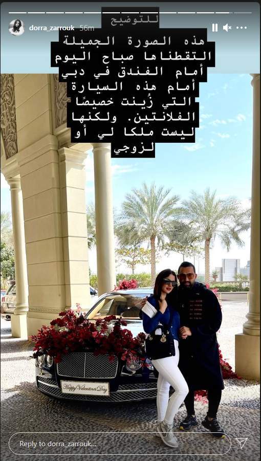 ونشرت درة عبر خاصية الاستوري صورتها رفقة زوجها والسيارة معلقة عليها قائلة: "للتوضيح.. هذه الصورة الجميلة التقطناها صباح اليوم أمام الفندق في دبي أمام هذه السيارة التي زينت خصيصا للفلانتين ولكنها ليست ملكا لي أو لزوجي.