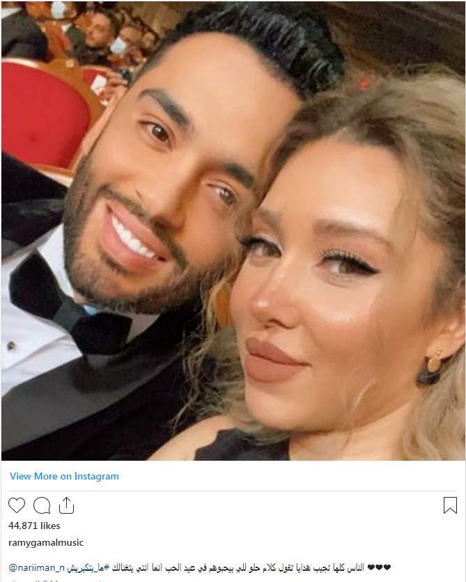 ونشر رامي جمال صورة تجمعه بزوجته معلقا عليها: "الناس كلها تجيب هدايا تقول كلام حلو اللي بيحبوهم في عيد الحب إنما أنتي يتغنالك #ما_بتكبريش".
