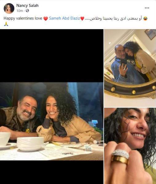 واحتفلت الفنانة نانسي صلاح، بعيد الحب مع خطيبها المخرج سامح عبد العزيز، كما كشفت في الصور التي نشرتها عبر حسابها على "فيس بوك" عن دبلة خطوبتها، وكتبت قائلة: "عيد حب سعيد حبيبي سامح أو بمعنى أدق ربنا يحمينا وخلاص".