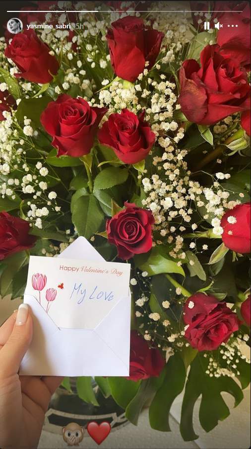 ونشرت ياسمين صبري صورة باقة ورد حمراء كبيرة، مع رسالة مكتوب عليها "عيد حب سعيد حبيبتي".