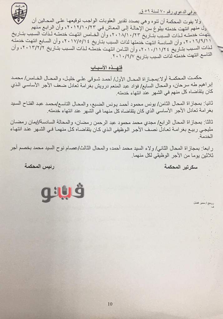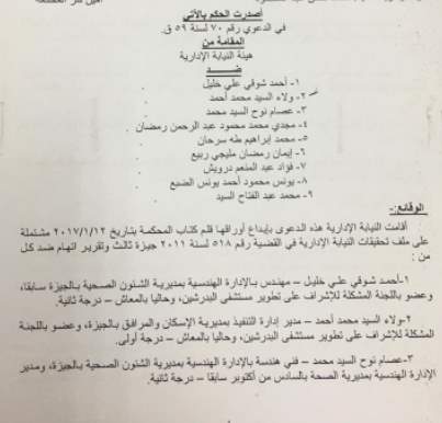 وأصدرت المحكمة حكمها بمجازاة أحمد شوقي علي ومحمد إبراهيم طه و فؤاد عبدالمنعم درويش بغرامة تعادل ضعف الأجر الأساسي الذي كان يتقاضاه في الشهر كل منهم عند انتهاء خدمته، وتغريم يونس محمود أحمد ومحمد عبدالفتاح السيد بما يعادل الأجر الأساسي الذي كان يتقاضاه كل منهم عند إحالته للمعاش، ومجازاة مجدي محمد محمود وإيمان رمضان مليجي بغرامة تعادل نصف الأجر الوظيفي الذي كان يتقاضاه كل منهم عند انتهاء خدمته، وخصم أجر 30 يومًا من راتب كل من ولاء السيد محمد وعصام نوح السيد.