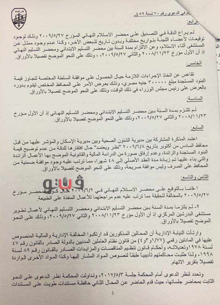 وجاء بأوراق القضية أن مجدي محمد محمود، عضو اللجنة التنفيذية بوزارة الصحة ورئيس اللجنة المشكلة لاستلام أعمال تطوير مستشفى البدرشين المركزي لم يراعِ الدقة في التصديق على محضر الاستلام النهائي، وذلك لوجود توقيعات لأعضاء اللجنة بتواريخ مختلفة ومن دون تاريخ للبعض الآخر، إضافة إلى عدم وجود ممثل عن المستشفى أثناء التسليم وعدم الالتزام بمدة السنة بين محضر التسليم الابتدائي ومحضر التسليم النهائي.