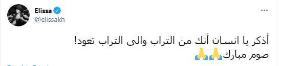 وكتبت إليسا تغريدة على تويتر قالت فيها: "اذكر يا إنسان أنك من التراب وإلى التراب تعود. صوم مبارك".