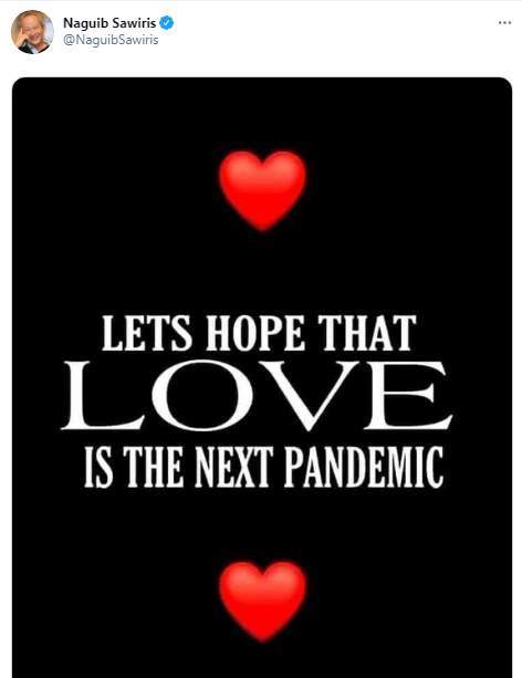 وكتب نجيب ساويرس تغريدة على تويتر قال فيها: "دعونا نأمل أن يكون الحب هو الجائحة المقبلة".