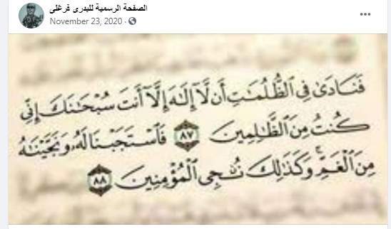 ودون الراحل البدري فرغلي عبر صفحته الرسمية بالفيس بوك يوم 23 نوفمبر 2020 آية قرآنية من سورة الأنبياء "فَنَادَى فِي الظُّلُمَاتِ أَن لَّا إِلَهَ إِلَّا أَنتَ سُبْحَانَكَ إِنِّي كُنتُ مِنَ الظَّالِمِينَ * فَاسْتَجَبْنَا لَهُ وَنَجَّيْنَاهُ مِنَ الْغَمِّ وَكَذَلِكَ نُنجِي الْمُؤْمِنِينَ } الأنبياء87-88.