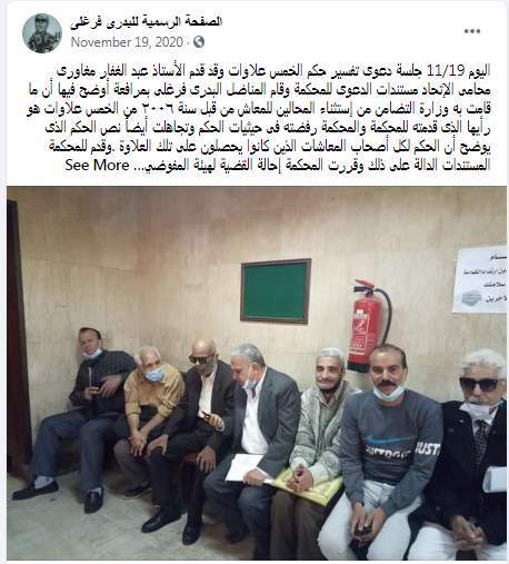 وجاءت التدوينة بعد تدوينة أخرى كتبها في 19 نوفمبر 2020 قال فيها "اليوم 11/19 جلسة دعوى تفسير حكم الخمس علاوات وقد قدم عبد الغفار مغاورى محامى الإتحاد مستندات الدعوى للمحكمة وقام المناضل البدرى فرغلى بمرافعة أوضح فيها أن ما قامت به وزارة التضامن من إستثناء المحالين للمعاش من قبل سنة ٢٠٠٦ من الخمس علاوات هو رأيها الذى قدمته للمحكمة والمحكمة رفضته فى حيثيات الحكم وتجاهلت أيضٱ نص الحكم الذى يوضح أن الحكم لكل أصحاب المعاشات الذين كانوا يحصلون على تلك العلاوة".