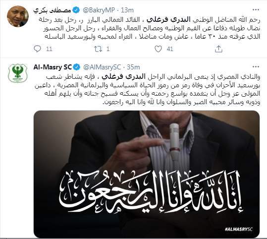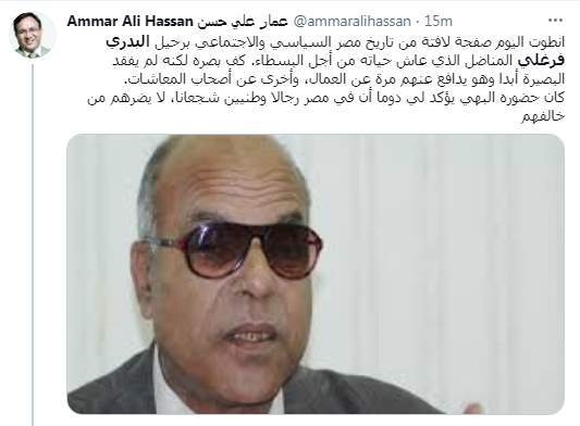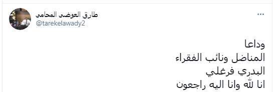 ونعاه المحامي طارق العوضي: "وداعا المناضل ونائب الفقراء البدري فرغلي انا لله وانا اليه راجعون".