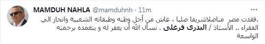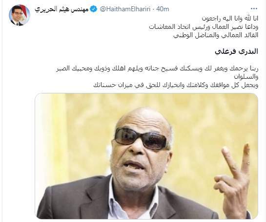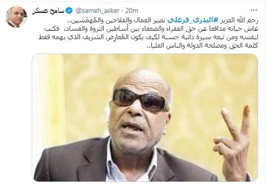 وكتب البرلماني السابق هيثم الحريري: "انا لله وانا اليه راجعون وداعا نصير العمال ورئيس اتحاد المعاشات القائد العمالي والمناضل الوطني البدري فرغلي ربنا يرحمك ويغفر لك ويسكنك فسيح جناته ويلهم اهلك وذويك ومحبيك الصبر والسلوان ويجعل كل موافقك وكلامتك وانحيازك للحق في ميزان حسناتك"