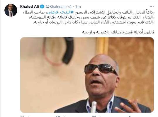 ونعاه المحامي الحقوقي خالد علي: "وداعاً للعامل والنائب والمناضل الإشتراكى الجسور #البدرى_فرغلى، صاحب العطاء والكفاح الذى لم يتوقف دفاعاً عن شعب مصر، وحقوق فقرائه وفئاته المهمشة، والذى قدم نموذج استثنائى للأداء النيابى سواء كان داخل البرلمان أو خارجه. فاللهم أدخله فسيح جناتك، واغفر له وارحمه".