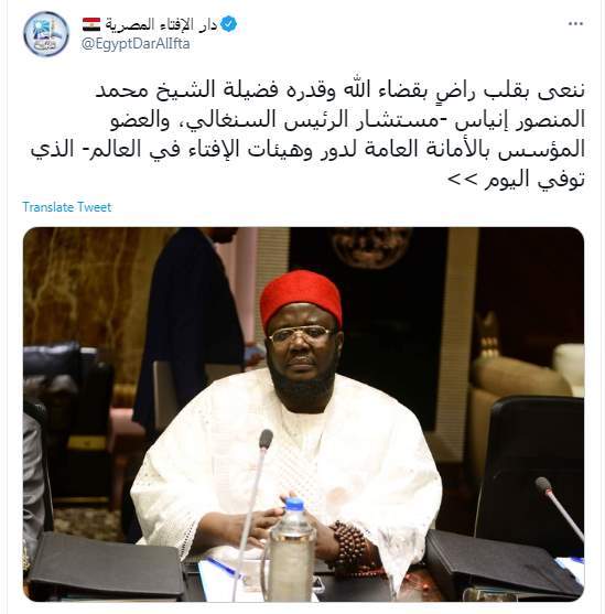 وكتبت دار الإفتاء تغريدة على تويتر "ننعى بقلب راضٍ بقضاء الله وقدره فضيلة الشيخ محمد المنصور إنياس -مستشار الرئيس السنغالي، والعضو المؤسس بالأمانة العامة لدور وهيئات الإفتاء في العالم- الذي توفي اليوم"