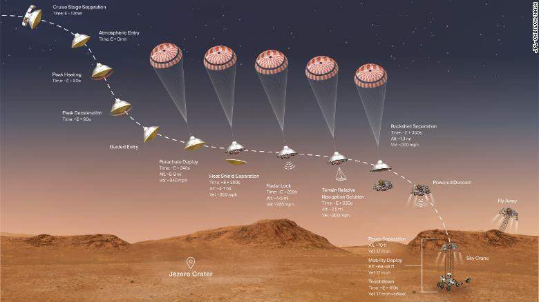 وسينفصل الغلاف الخلفي والمظلة بعد التخلص من الدرع الحراري، وهذا سيحدث عندما تكون المركبة الفضائية على ارتفاع 1.3 ميل فوق سطح المريخ .